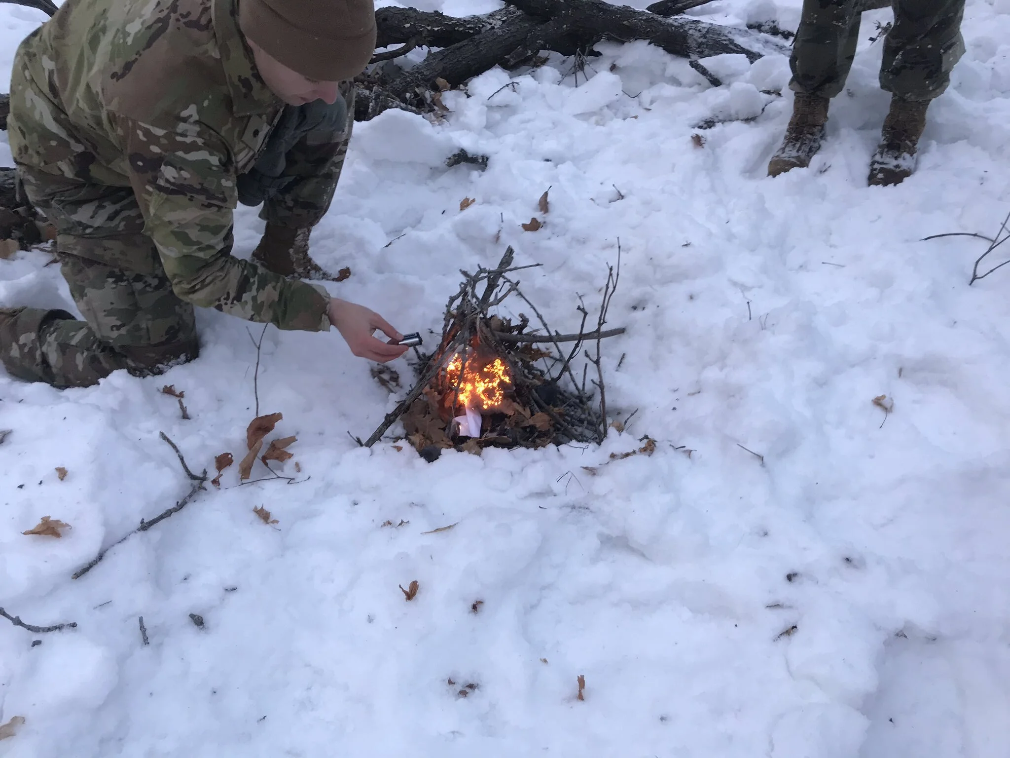 MSIV cadet demonstrating a proper way to build a fire with limited supplies.
